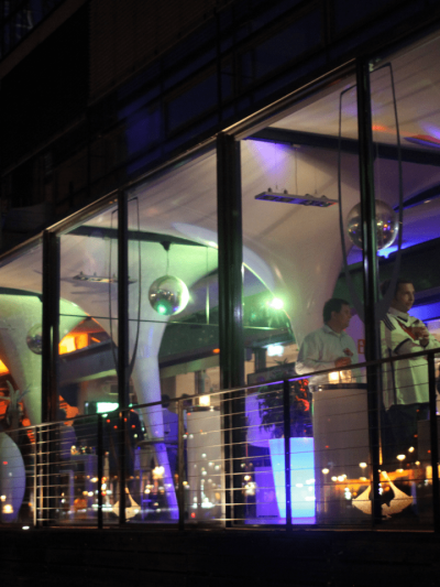 - The highlight is the bookable laser projection onto the Dockland building across the street.